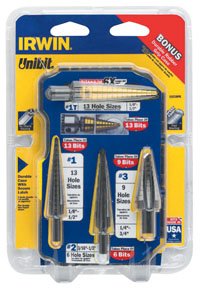 3 pc. Unibit Set in Durable Pro Case with FREE #1T Bit In durable hard case.Set Includes: #1 Bit (VSG-102301) 1/8 1/2 by 1/32 steps #2 Bit (VSG-10232) 3/16 1/2 by 1/16 steps #3 Bit (VSG-10233) 1/4 3/4 by 1/16 steps with FREE #1T Bit (VSG-15101) 1/8 1/2 by 1/32 steps